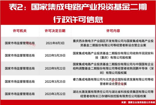 截至目前,大基金一期涉及行政许可事项1件,大基金二期则涉及5件(见表1、表2)。