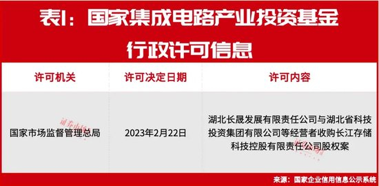 大基金一期涉及的行政许可事项与大基金二期有关,即“湖北长晟发展有限责任公司与湖北省科技投资集团有限公司等经营者收购长江存储科技控股有限责任公司股权案”。据天眼查APP,长江存储股东信息显示,大基金一期认缴出资日期为2019年12月20日,大基金二期认缴出资日期为2023年1月31日,认缴出资额分别为1355842.11万元、1288673.4904万元,持股比例分别为12.8796%、12.2416%。