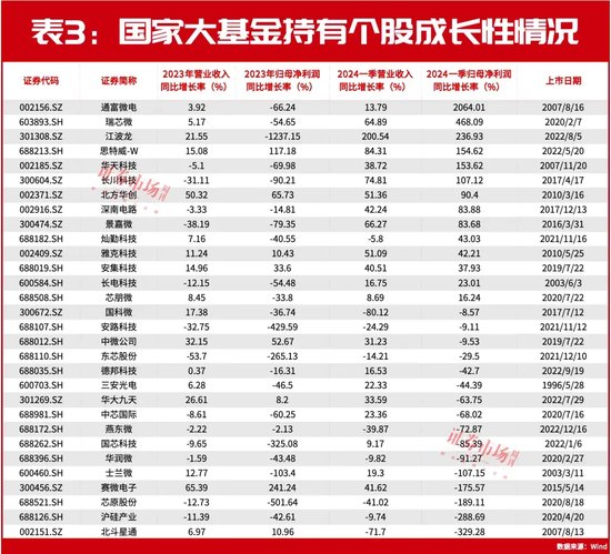 整体看,国家大基金持有的公司主要是成长中的集成电路公司,也涵盖一些短期亏损公司,比如2023年亏损的士兰微、国芯科技、安路科技、芯原股份、东芯股份和江波龙,亏损规模在0.36亿元-8.28亿元不等。不过,至今年一季度,上述亏损公司中的江波龙实现归母净利润3.84亿元,成功扭亏。