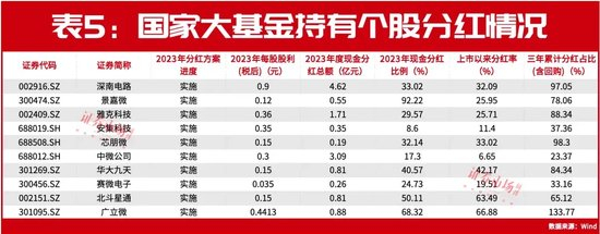 从分红角度观察,大基金持有的集成电路公司有分红预期的公司数量为24家,截至目前已经实施分红的公司数量为10家(见表5)。其中,2023年度现金分红总额居前的是深南电路,为4.62亿元。三年累计分红占比(含回购)较高的是深南电路和芯朋微,分别为97.05%和98.30%。