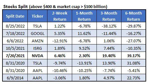 其中一些市值超过1000亿美元、拆分前股价超过400美元的大型股,拆分后的表现就更加平平,甚至表现惨淡。据统计,这些股票拆股后六个月内平均亏损2.66%,仅37.5%的案例收益为正,而同期标普500指数的平均收益率则为3.8%。