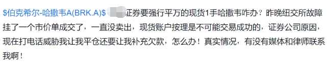 例如,有投资者便在社交平台上反映,自己所在券商要强平成交的伯克希尔哈撒韦股票,并要求其补充欠款。