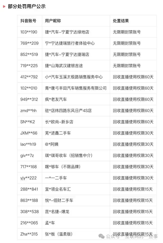 面对直播卖车的低俗化现象,平台方也开始采取措施进行治理。例如,抖音平台已经对汽车行业的“擦边”营销问题进行了全面整治,自2024年4月至今,共处罚违规账号2,632个,其中对存在严重违规行为的582个账号回收了直播权限,无限期封禁账号24个。