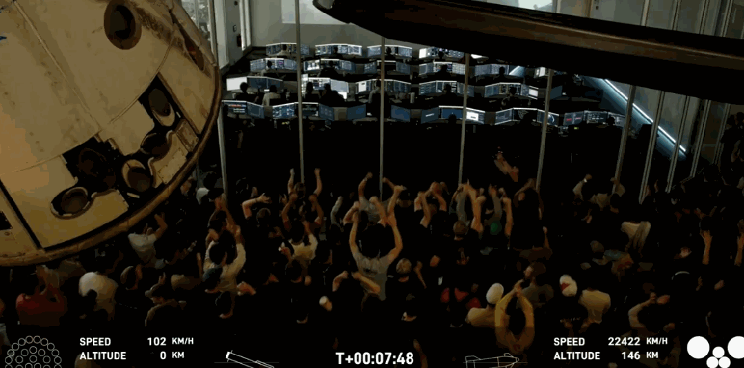 北京时间21点55分:飞船成功实施着陆点火和翻转,成功在印度洋溅落。SpaceX员工疯狂庆祝!