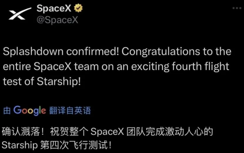 随后,SpaceX宣布,星舰本体确认在印度洋溅落,第四次试飞取得成功。