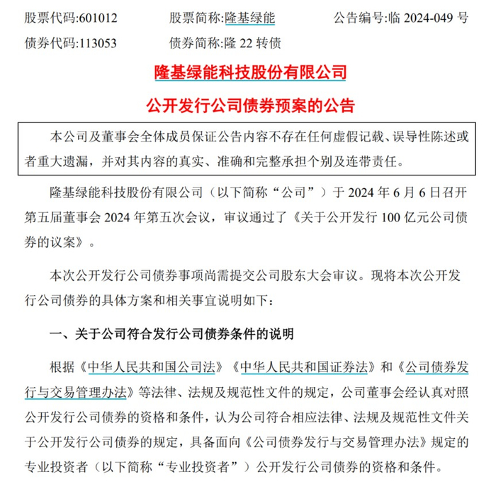 根据隆基绿能公告显示,该公司拟发行不超100亿元债券,主要用于满足公司经营需要、补充流动资金、偿还有息负债、支持项目建设及运营、权益出资及适用的法律法规允许的其他用途。