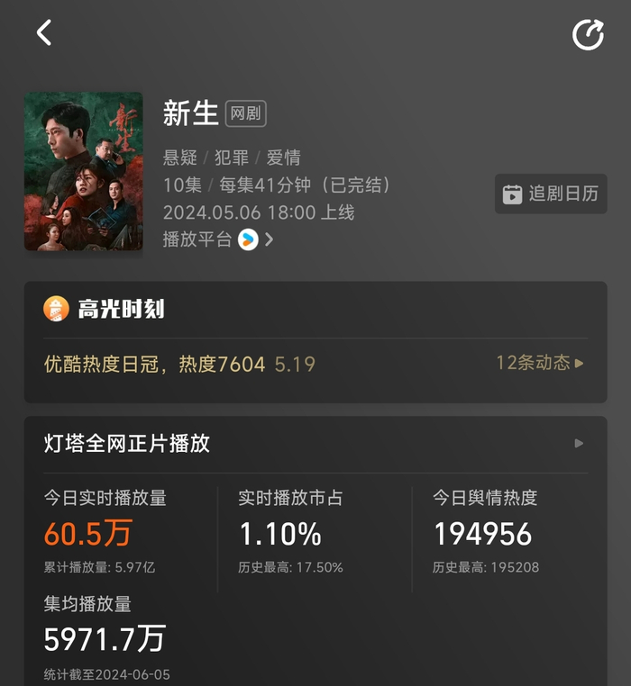 另一边,优酷也在5月初,上线了剧作《新生》,灯塔专业版显示:其集均播放量接近6000万,超过了《庆余年2》,并出海在奈飞平台上线。