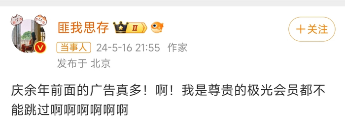 同时,作家匪我思存也表示:“《庆余年2》前面的广告真多,我是尊贵的极光会员,都不能跳过。”