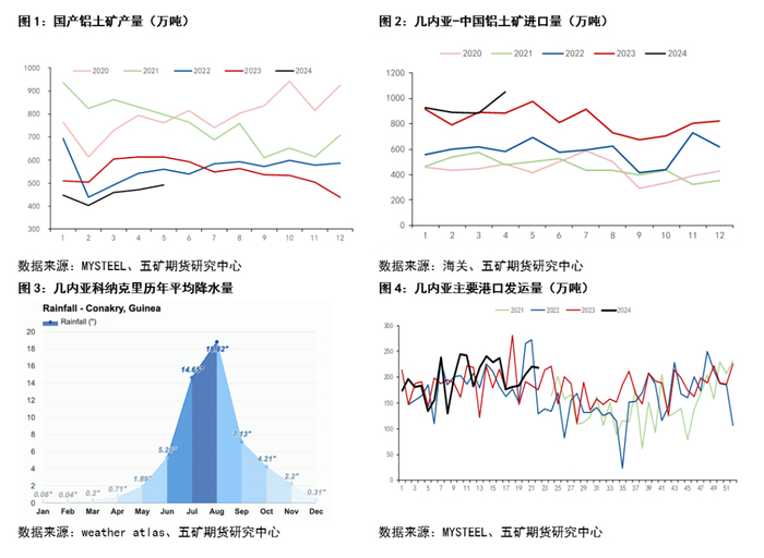 进口矿方面,下半年几内亚铝土矿产量仍有增量,但预计5-10月雨季将降低几内亚铝土矿发运,对下半年铝土矿到港量产生影响。从最近几周几内亚铝土矿发运量观察,截止5月31日最新一周,几内亚主要港口发运量219万吨,环比减少3万吨,仍未见明显的下行趋势。依据weather atlas统计的历史降雨量数据显示,几内亚主要港口城市科纳克里降雨高峰期为7-9月。从历史几内亚铝土矿进口量数据看,过去两年6、7、8、9月的进口量分别环比-17.06%、8.01%、-7.44%、-20.75%,整体呈现明显下降趋势。因此,预计下半年进口铝土矿的供应仍存不确定性,需进一步跟踪几内亚发运量。
