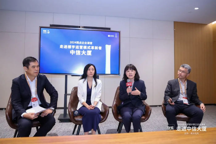 大概半小时的参观过后,观点企业课堂嘉宾与中信和业高层共坐一堂,共同分享与交流中信和业在商办楼宇资产运营、物业服务、城市更新方面的实践,探讨商办暨资管发展前路、业务融合的创新经验。