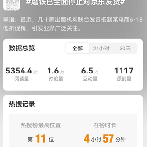 这个热搜的起因是,出版人沈浩波在朋友圈发布长文,“在磨铁已经全面对京东停止发货,并一再对京东低价乱价扰乱市场秩序的行为表达反对的情况下,京东依然无视我们的诉求,要继续强行让我们的产品参加他们的低价促销。”