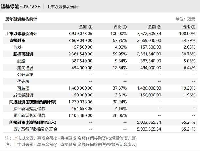 Wind数据显示,隆基绿能上市以来共计募资393.91亿元,其中,直接融资266.9亿元,股权再融资236.15亿元,间接融资(按增量负债计算)127亿元。