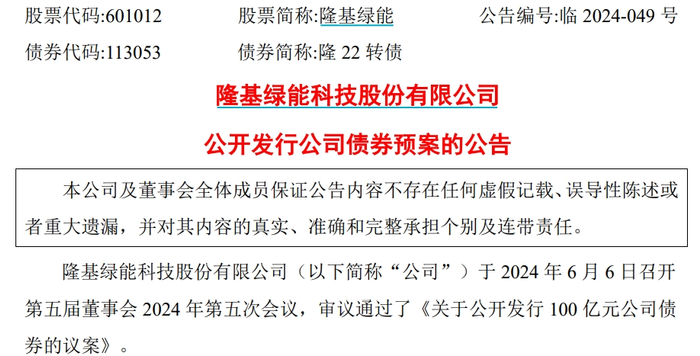 同日晚间,隆基绿能一纸公告宣布,拟公开发行不超过100亿元公司债券。