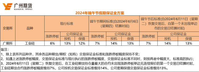 2024年6月11日(星期二)恢复交易后,在工业硅期货持仓量最大的合约未出现涨跌停板单边无连续报价的第一个交易日结算时起,工业硅期货合约涨跌停板幅度维持7%不变,公司投机交易保证金标准维持14%不变,公司套期保值交易保证金标准维持13%不变。