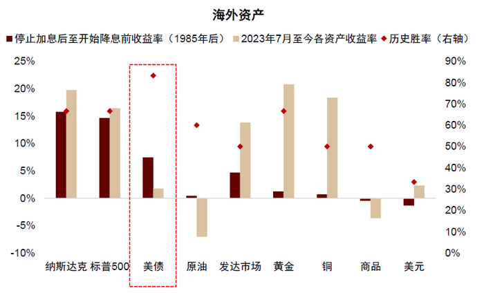 图表14:美联储加息结束后到降息开始前,美债胜率最高
