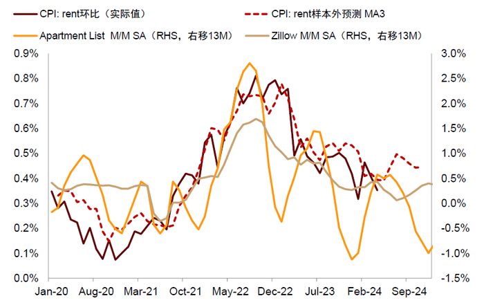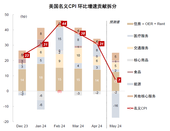 与此同时,残余季节性(Residual Seasonality)可能从推高通胀转为压低通胀,让通胀读数有一定概率低于我们的模型计算与市场一致预期。由于12个月之前通胀环比增速较低,基数效应导致通胀同比增速较前值变化不大,我们预测名义与核心CPI同比分别为3.4%与3.5%。往前看,美国通胀可能继续改善,只要不出现黑天鹅事件,模型预测CPI通胀今年会落到2.5%-3%区间,PCE落到2%-2.5%区间,没有观察到二次通胀的风险。