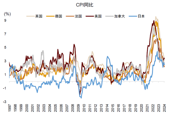通胀改善不但发生在美国,自去年底至今,德国CPI同比下降150bp, 英国下降110bp, 加拿大下降70bp,德法CPI通胀已经回到2%附近(图表12)。