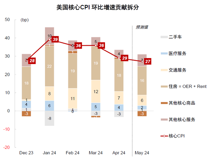 5月份美国CPI将于6月12日(周三)公布。中金大类资产模型预测美国名义CPI环比0.07%(一致预期0.1%,前值0.31%,图表1),核心CPI环比0.27%(一致预期0.3%,前值0.29%,图表2)。