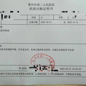2023年10月底,郭先生带小茵前往惠州市第二人民医院就诊。据医院官方简介,惠州市第二人民医院创建于1966年,是三级精神心理专科医院,现为三块牌子(惠州市第二人民医院、惠州市精神卫生中心、惠州市荣军优抚医院)一套人马。经医生面谈和自评量表,医生最终诊断小茵未出现抑郁、焦虑、躁狂等病症。该医院10月31日出具的疾病诊断证明书显示,该来访者目前情绪平稳,无不适主诉,各项心理评估无异常,可进行正常的学习生活。
