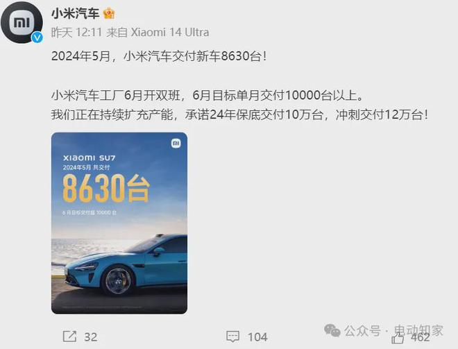 6月1日,小米汽车发布消息,2024年5月,小米汽车交付新车8630台!小米汽车工厂6月开双班,6月目标单月交付10000台以上。在交付首月,也即4月份交付7058台,自交付以来累计交付量超1.5万台,目前该车累计锁单量达到8.8万台。
