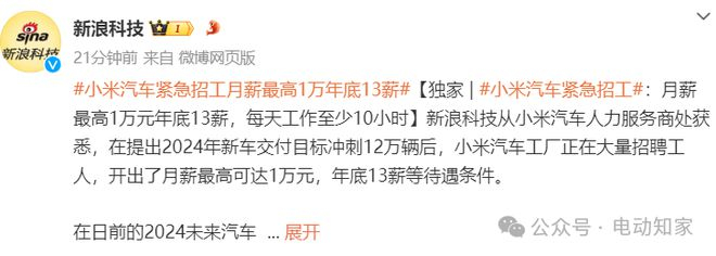 电动知家消息,6月7日上午,据新浪科技报道,在提出2024年新车交付目标冲刺12万辆后,小米汽车工厂正在大量招聘工人,开出了月薪最高可达1万元,年底13薪等待遇条件。