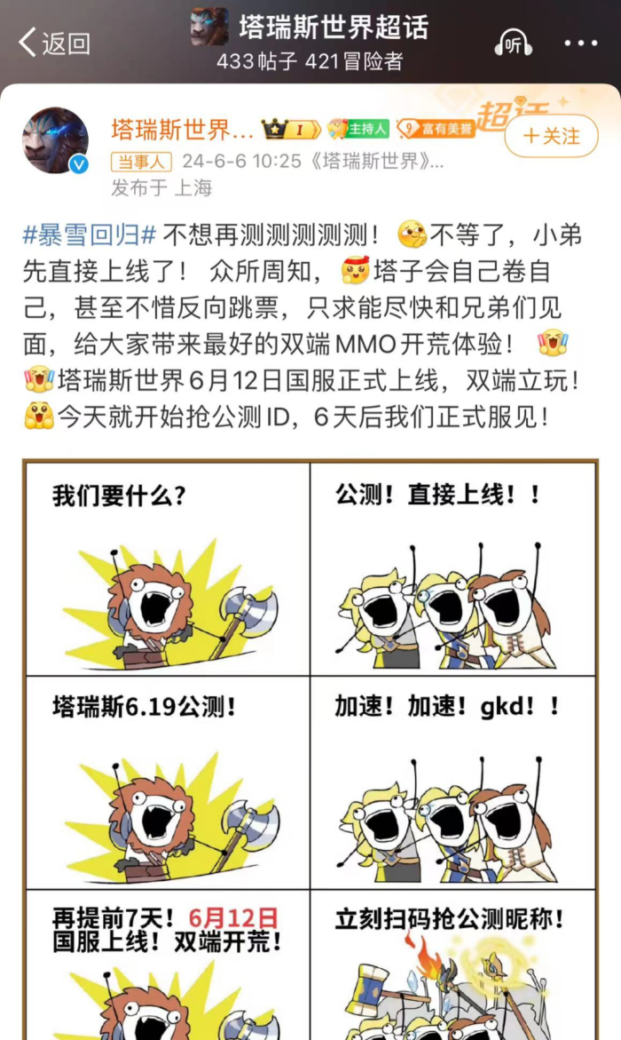 而隐藏在“回归”背后的,是围绕研运代理等业务下,头部厂商之间愈渐浓烈的硝烟。今日(6月6日),腾讯代理的mmorpg游戏《塔瑞斯世界》开启“反向跳票”,提前一周上线国服,将#塔瑞斯世界提前上线#送上热搜。这是一款自诞生之初便被业界认为是款“类魔兽”的手游,官号更是在宣传上“硬刚”气息强烈。