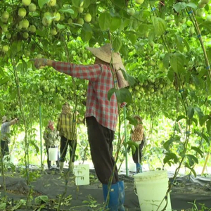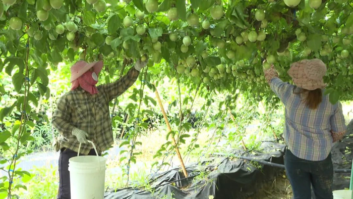 见习记者佟瑶:“我现在就在六弓乡一处百香果基地里,一排排百香果藤蔓爬满棚架,繁茂的枝叶下挂着一颗颗硕大、饱满的果实,惹人喜爱,稍微靠近一点就能闻到浓浓的果香味。”