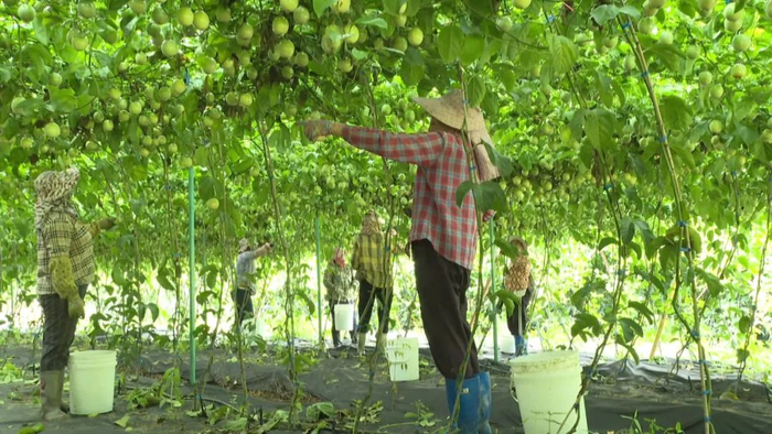海南六弓草马岭休闲农业旅游发展有限责任公司总经理胡国玲:“每天采摘2万斤到5万斤,现在百香果的行情是小果3块、中果是5块、大果是7块、特大果是9块,根据现在的市场行情,价格还是可以的,很可观。”