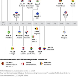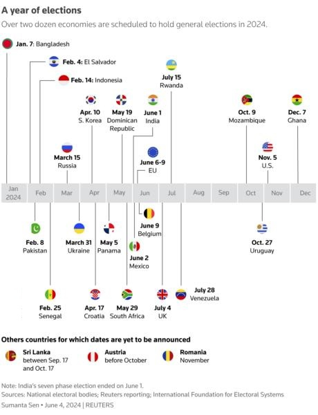 事实上,早在年初,人们就曾对今年市场上主要的宏观影响因素有过两个形象的概述:“降息年”和“大选年”。“降息年”是指全球央行很可能陆续会在今年步入降息周期;而“大选年”则是因为,全球至少有多达40个国家和地区将在年内举行大选。