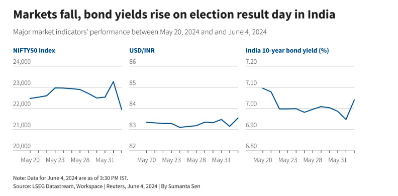 而在印度,当地市场在过去几天遭遇的冲击也同样惊人。虽然印度总理莫迪一如预期赢得了其创纪录的第三个任期。不过他所属的印度人民党在国会丢失了60多个席位。这次意外的大选滑铁卢,将使莫迪不得不更为依赖其国家民主联盟(NDA)内的其他结盟政党。