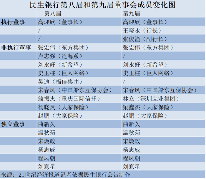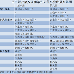 21世纪经济报道梳理发现,民生银行第九届董事会执行董事由过去的一名增加为三名,董事长高迎欣席位不变,新增席位为新任行长王晓永和新任副行长张俊潼。非执行董事由过去的九位减少至七位,其中卢志强(泛海系)出局,翁振杰(重庆国际信托)、吴迪(福信集团)被提名为股东监事,新入局者为林立(深圳立业集团)、粱鑫杰(大家保险)。独立董事席位不变,曲新久、温秋菊、宋焕政、杨志威、程凤朝、刘寒星均为上届连任。