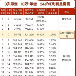 “3岁男宝趸缴10万元,7岁时红利利益超保费,24岁时红利利益翻2倍。”