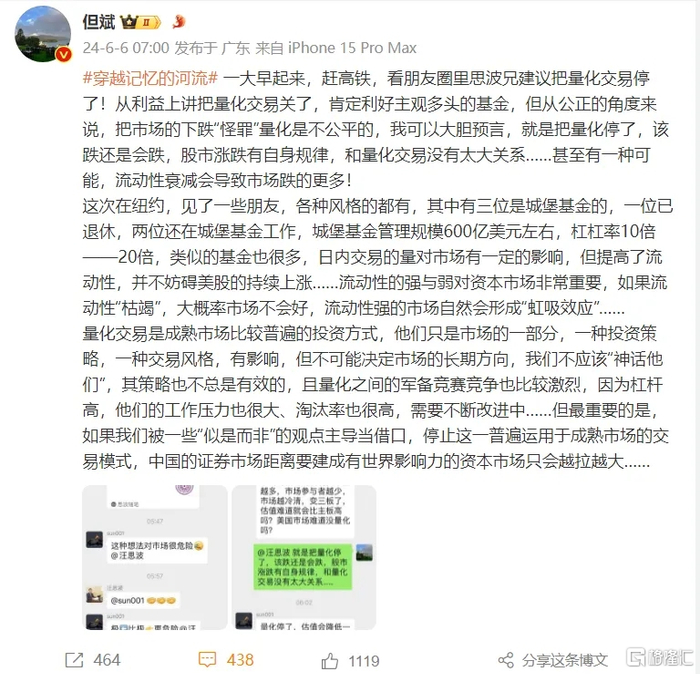 但斌喊话表示:有人建议把量化交易停了,把市场的下跌“怪罪”量化是不公平的。