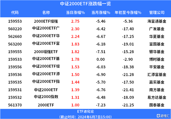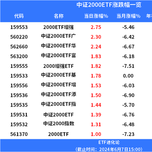 海富通基金2000ETF增强、中证2000ETF广发、中证2000ETF华夏涨超2%,中证2000ETF富国、银华基金2000增强ETF、博时基金中证2000ETF基金、平安基金中证2000ETF增强、中证2000ETF添富涨超1.5%。