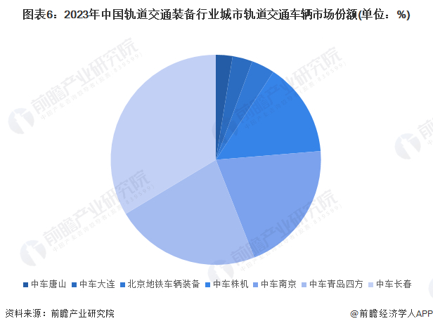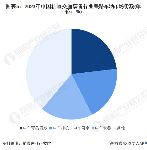 2023年,在铁路车辆方面,中车青岛四方的市场份额排名第一,占比达23.13%;中车株机和中车南京的联合体市场份额排名第二,占比19.40%;中车长春排名第三,占比18.66%。