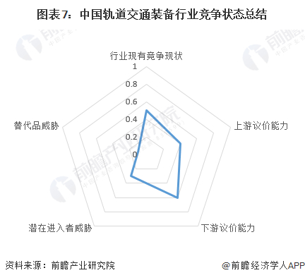 根据以上分析,对各方面的竞争情况进行量化,1代表最大,0代表最小,目前我国轨道交通装备行业五力竞争总结如下: