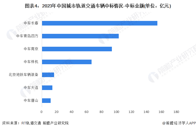 2023年,全国城市轨道交通车辆中标金额合计达458.70亿元。其中,中车长春的中标金额最高,达154.14亿元;中车青岛四方和中车南京分列第二和第三名,中标金额分别为102.60亿元和93.35亿元。从中标企业的控股情况来看,7家中标企业中有6家由中国中车控股。结合铁路车辆的中标情况可以发现,中国中车在轨道交通车辆市场上占有较高的市场份额及垄断性的竞争实力。