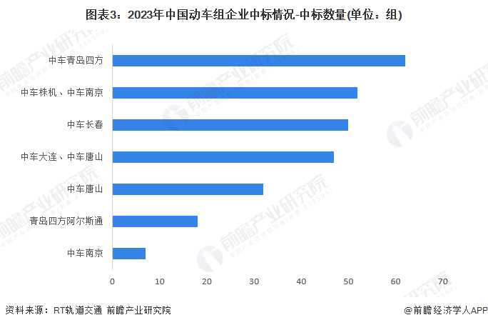 2023年,全国动车组共发布7次招标公告,合计268组。从中标情况来看,中车青岛四方的中标数量最多,达62组;其次是中车株机和中车南京的联合体,共中标52组。从中标企业的控股情况来看,中标动车组的所有企业均由中国中车控股。