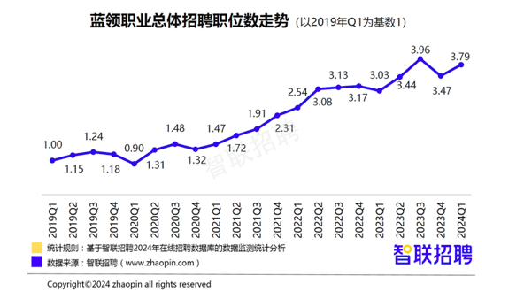 报告显示,2019年以来,蓝领岗位招聘需求持续上升。以2019年一季度为基数1,蓝领招聘职位数逐季波动上升,至今年一季度达到3.79,是2019年一季度的3.79倍。