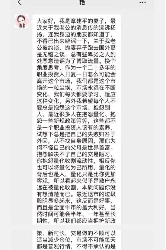 到了本周,更有自称章建平妻子截图传出,网名为“艳”的人士发文称“被约谈、抛妻弃子跑去国外更是无稽之谈,总有些卑劣之人到处恶意造谣为博取流量”。随后该文对市场、量化发表看法。