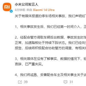 针对“小米SU7冲出停车场致一死三伤”的网上信息,6月7日下午,@小米公司发言人 发布声明,全文如下: