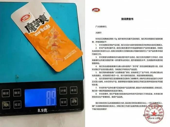 此事一经曝光,立即引发了社会各界的广泛关注与热烈讨论,并迅速登上热搜榜单。面对舆论的持续发酵,卫龙在短短一天之内,就针对产品“缺斤少两”的问题两次发表致歉声明。然而,消费者对卫龙的质疑并未因此得到有效平息。