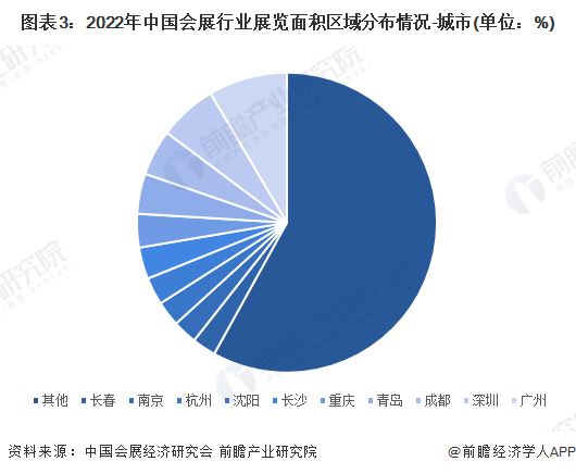 2022年,中国共举办2682场线下展览,展览总面积为4879万平方米。具体到城市来看,举办展览数量最多的城市为广州,共举办193场,占全国的比重达到7.20%。此外,举办场数超过100场的城市还有长沙、沈阳、武汉、成都、南京,占全国的比重均在4%以上。