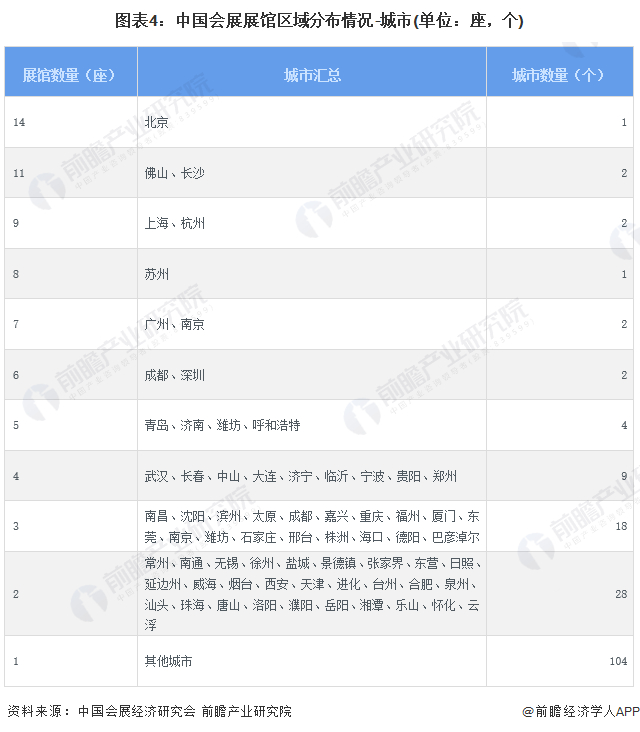从会展场馆的城市分布来看,全国展馆数量超过10座的城市有北京、佛山和长沙,其中北京的展馆数量达到14座,排名全国第一;佛山和长沙的展馆数量均为11座。此外,上海、杭州的场馆数量也较多,分别拥有9座会展展馆。
