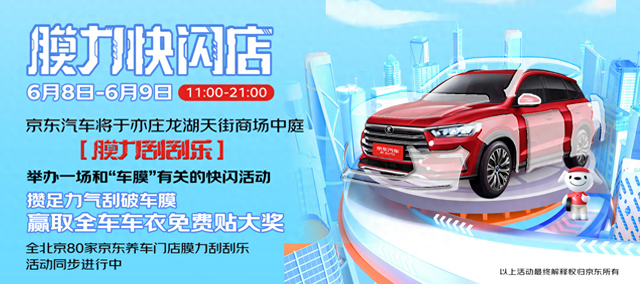 不仅如此,6月8日至9日,京东汽车 “膜力快闪店”将空降北京亦庄龙湖天街商场,现场带来由车膜制成的“全北京最大的刮刮乐”,消费者可以选择银行卡、钥匙、石子,甚至是铲子来刮蹭车膜,只要刮破就有机会赢取全车车衣免费贴的大奖。同时,活动现场还设有多个互动区域,带来互动游戏、科普知识等内容以及京东汽车专业技师现场贴膜展示等活动。除了互动活动,京东汽车还为现场的消费者带来“下单国际大牌立减3000”等众多福利。与此同时,北京区域的京东养车门店也将同步推出“膜力刮刮乐”活动,消费者在社交平台分享活动内容即可参与,还有机会赢取免费贴车衣大奖。