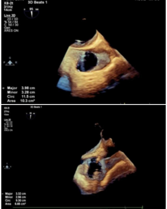 该患者二尖瓣机械瓣置换术后,隔瓣受牵拉导致瓣叶拴系,对和不良,三个瓣叶相互之间GAP较大。经团队综合评估,决定在三尖瓣后隔瓣环交界处植入12T K-Clip®、前后瓣环交界处植入14T K-Clip®,通过缩小瓣环、增加瓣叶对合,达到关闭缝隙、改善反流的效果。