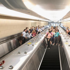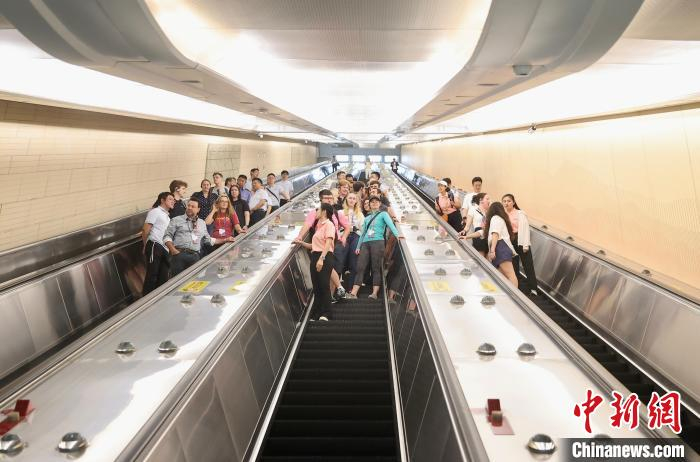 6月6日,“未来之桥”中美青年交流计划之中国中铁基建智能化建造交流活动在北京举行,图为美国青年乘坐八达岭长城站的大电梯。中新社记者 易海菲 摄