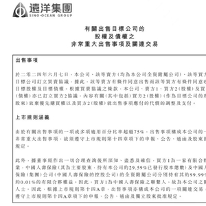 6月7日晚间,远洋集团(HK03377,股价0.45港元,市值34亿元)公告称,转让北京颐堤港二期64.79%的股权及相关债权,总代价40亿元,由中国人寿、太古地产联合接手。其中,中国人寿出资约31亿元,太古地产出资约9亿元,二者分别获得颐堤港二期49.895%、14.895%股权。本次交易完成后,中国人寿与太古持有同等比例的股权。