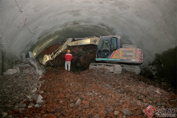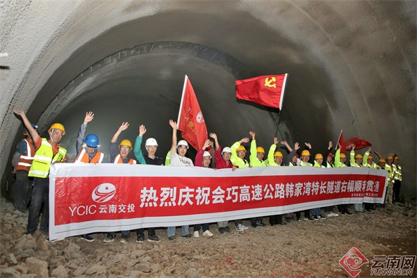 上午9时58分,韩家湾特长隧道右幅一片火热,鞭炮声响起,工人们拉起“热烈庆祝会巧高速公路韩家湾特长隧道右幅顺利贯通”横幅,喊着响亮的口号,欢呼声响彻云霄。