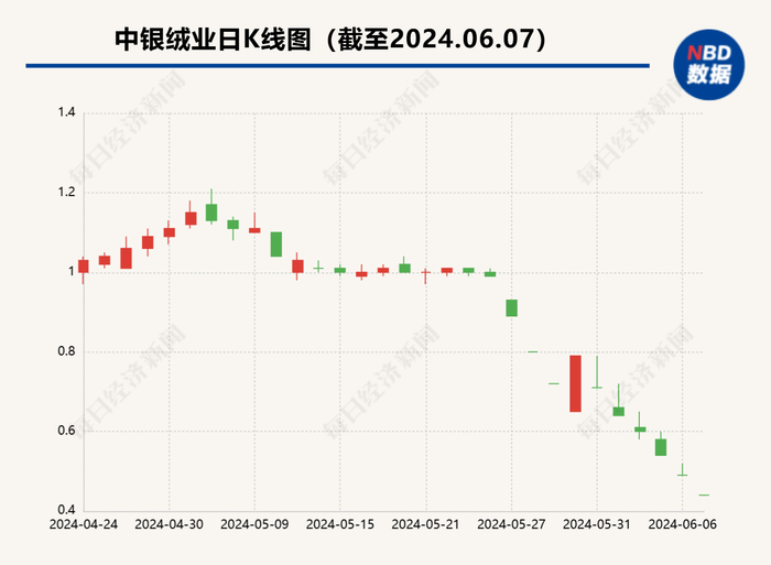 6月7日,中银绒业股价跌停,成交额仅2530万元,收盘价为0.44元。自5月27日以来,中银绒业区间跌幅高达55.56%。
